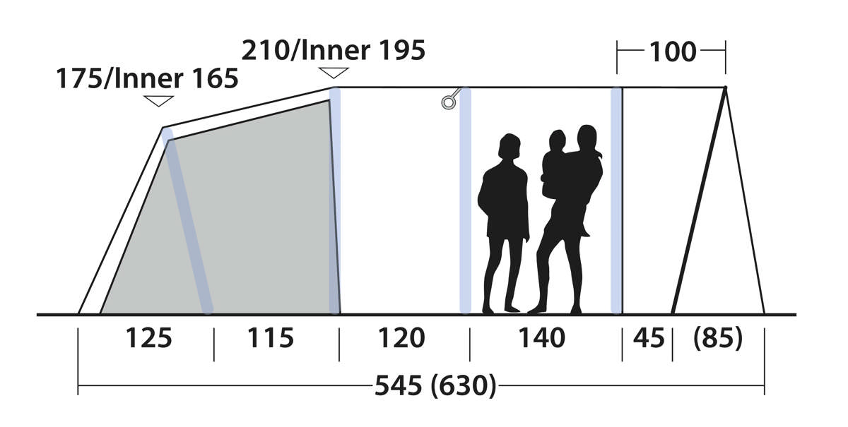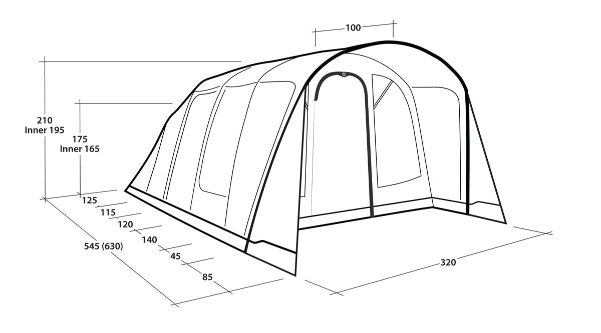 Spacious three-room tunnel tent for 5. Features pre-shaped air tubes, waterproof groundsheet, and great ventilation for comfort. Easy inflate/deflate design.