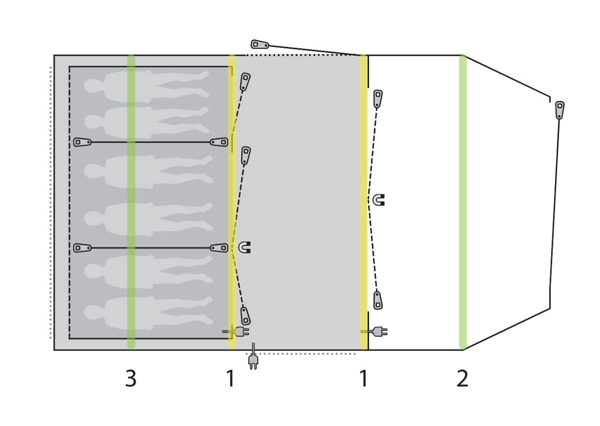 - Three zones provide a large family with wet room, dry living room and bedroom