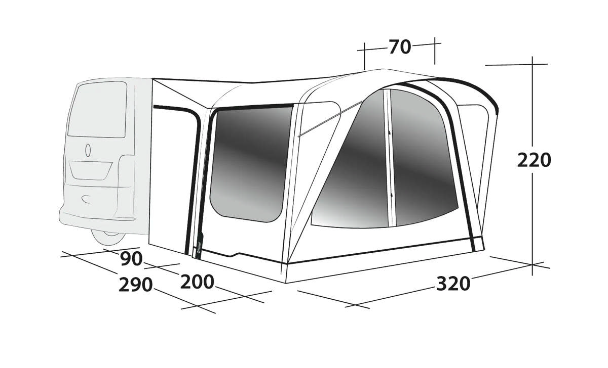 - With easy attachment to either side of your campervan, the fast-pitching inflatable Outwell Parkville 200SA drive away awning offers flexible extra living space for couples and small families that frees up your van for new adventures every day. Large, tinted windows in the extra wide side doors fill the tent with light, connecting you with the world outside. Made with outstanding durable, fully waterproof, ripstop fabric, you’ll enjoy excellent, easily adjusted ventilation. The living area, with ample headroom, can also be fitted with an optional inner for older kids or friends to sleep in privacy. You’ll relish the shade of the front canopy that offers you stable shelter to enjoy relaxing with the sights and sounds of nature. Plus, you can roll away the front wall for an even closer connection with the outdoor world. Prepared for the Outwell Nightlight System (patented) providing built-in lighting inside and outside the tent powered by optional ONS Light Unit Sets.