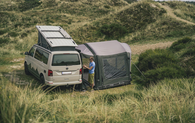 Building on the tent extension concept, we have developed a versatile canopy for the Deluxe Collection for campers to benefit from several pitching options for additional shade, shelter and privacy. The canopy can be adjusted quickly in changing conditions.