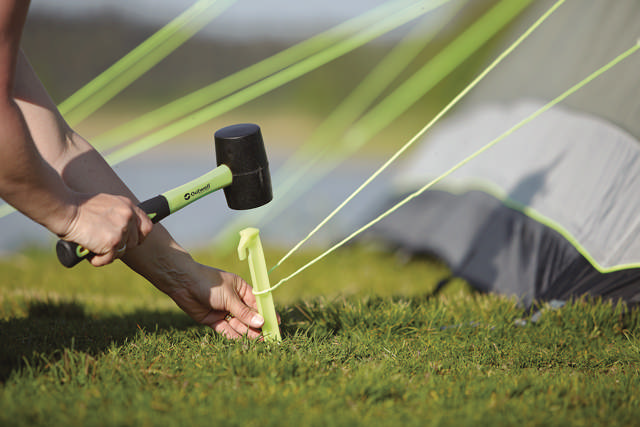 Special use of three different colour-coded types of pegs ensures pitching is both straightforward and contributes to the inherent stability of any Outwell tent. Here, we use grey anchor steel pegs at each corner, black plastic pegs for general pegging out, and luminous pegs to complement the guylines. Simple, but so highly effective.