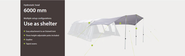 Utöka ditt boendeutrymme eller få skydd på språng – den mångsidiga Canopy Tarp kan användas med ett Outwell-tält eller på egen hand. Snabb och enkel att sätta upp, perfekt för dagsutflykter, campingsemestrar och familjenöje. De tre stolparna är höjdjusterbara för att passa alla tält eller terräng.