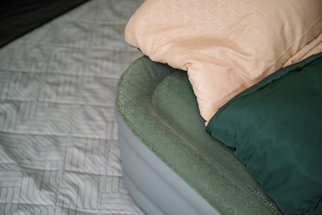 It’s easiest to clean your air bed while it’s inflated. Use a soft brush or your hand to sweep away any loose dirt (if you’re at home, you can vacuum it). Sponge down any dirty marks with water and a few drops of mild detergent. Don’t use harsh chemicals, which could degrade the material. Dry the air bed thoroughly before you pack it away.