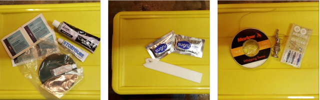 Snöre, vaxad tråd och nålar klarar de flesta reparationer, från spruckna tältstänger till hål i tyget. Mitt hemma-kit innehåller segelmakarnålar och palm för större, mer permanenta jobb. Clingons hjälper till att reparera öljetter och, när de används med cam-cleats och reservlinor, underlättar de uppsättning av presenningar.