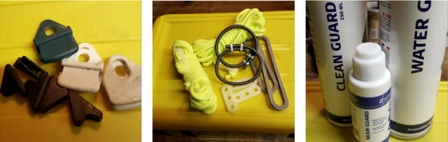 En bra uppsättning av tältlinor, linlöpare och elastiska/ gummiband för pluggar är också användbart.