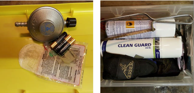 Jag lägger till saker som batterier, reservmantlar och regulatorer beroende på vilken campingutrustning som används.