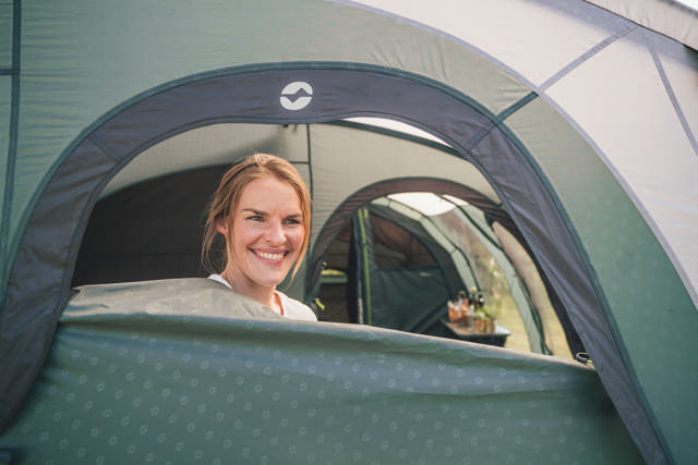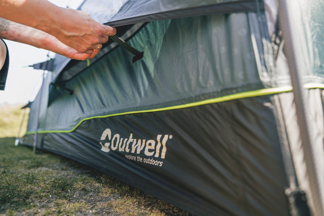Ventilationsöppningar och nätpaneler på dörrarna finns i sovrummen för att främja luftflödet. De inre väggarna som skiljer framsidan och vardagsrummet i Outwells trezons tält har också stora nätpaneler för att förbättra luftcirkulationen.