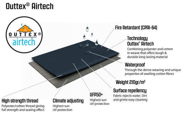 Outtex® Airtech tar campingkomforten till nya nivåer. Tillverkat av polycotton, en blandning av polyester och bomull; detta material kombinerar det bästa av båda tygerna. Det är extra andningsbart och håller tältet fräscht och ventilerat, även under de varmaste eller fuktigaste dagarna. På regniga dagar gör Outtex® Airtechs speciella vattenavvisande beläggning och täta väv att regn pärlar sig och rinner av. Samtidigt sväller materialets naturliga fibrer, vilket ökar vattentåligheten men tillåter vattenånga att släppas ut, vilket eliminerar kondens inne i tältet.