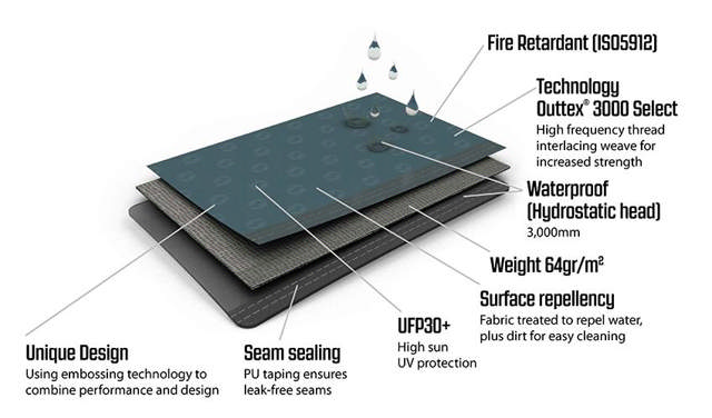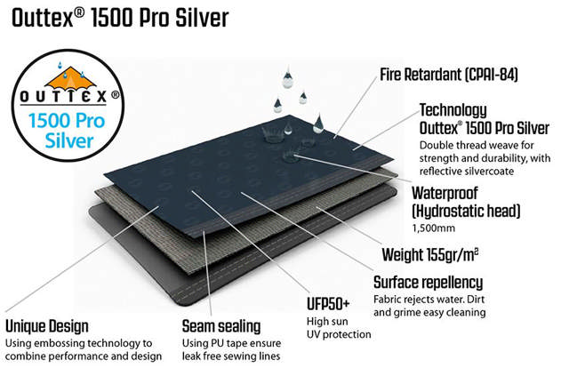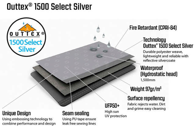 Håll dig säker från väder och vind hela dagen med Outtex® 1500 Select Silver. Detta högkvalitativa, lätta polyestertyg med en vikt på XXg/m² har en speciell värmereflekterande silverbeläggning, som hjälper till att ge skugga och hålla dig sval när du sitter under det. Solskyddet kommer från en UPF 50+ klassificering, så att hela familjen kan äta, leka och umgås i komfort. Samtidigt fungerar en PU-beläggning som en vattentät barriär och ger ett vattenpelarvärde på 1 500 mm.