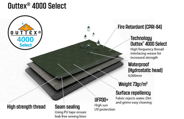 Letar du efter ett slitstarkt och högkvalitativt tältmaterial som kan hantera de tuffa utmaningarna i ett utomhusliv med familjen? Outtex® 4000 Select är perfekt för jobbet. Taffeta-polyesterväven är starkare och mer hållbar än vårt standardtältmaterial, vilket gör det ännu mer motståndskraftigt mot revor och slitningar. Materialets vattentäta PU-beläggning har ett vattenpelarvärde på 4 000 mm, vilket är 30 % högre än vårt standardmaterial.