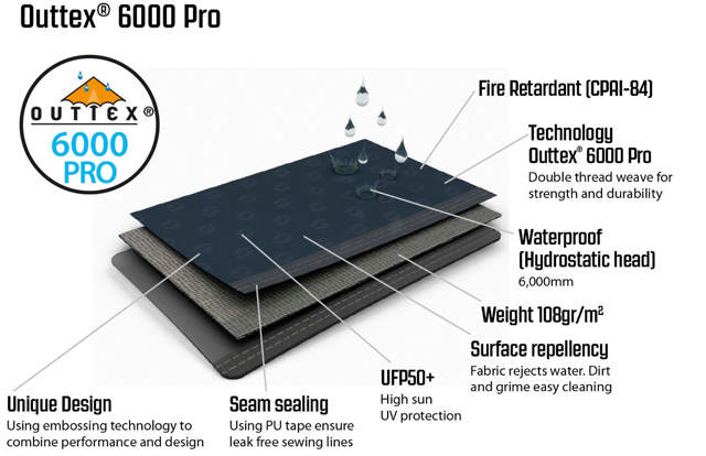 Älskar du att campa året runt? Då är det dags att gå proffs. Gjord för seriösa campare är Outtex® 6000 Pro ett förstklassigt polyestertyg som är fyllt med fantastiska funktioner. Som den förstärkta Oxford-väven som gör det starkare och mer motståndskraftigt mot revor än andra polyestertyger. Eller den vattentäta PU-beläggningen med ett imponerande vattenpelarvärde på 6 000 mm, vilket är dubbelt så mycket som vårt standardtältmaterial.